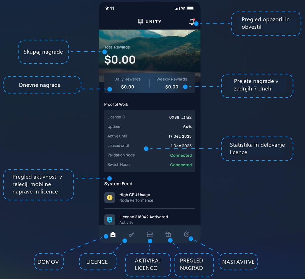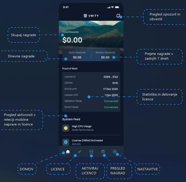 Unity ne zbira osebnih ali identificirajučih podatkov. Zabeleženi so le tehnični podatki za preverjanje dejavnosti omrežja in izdajo nagrad (npr. meritve kakovosti, anonimizirane statistike).