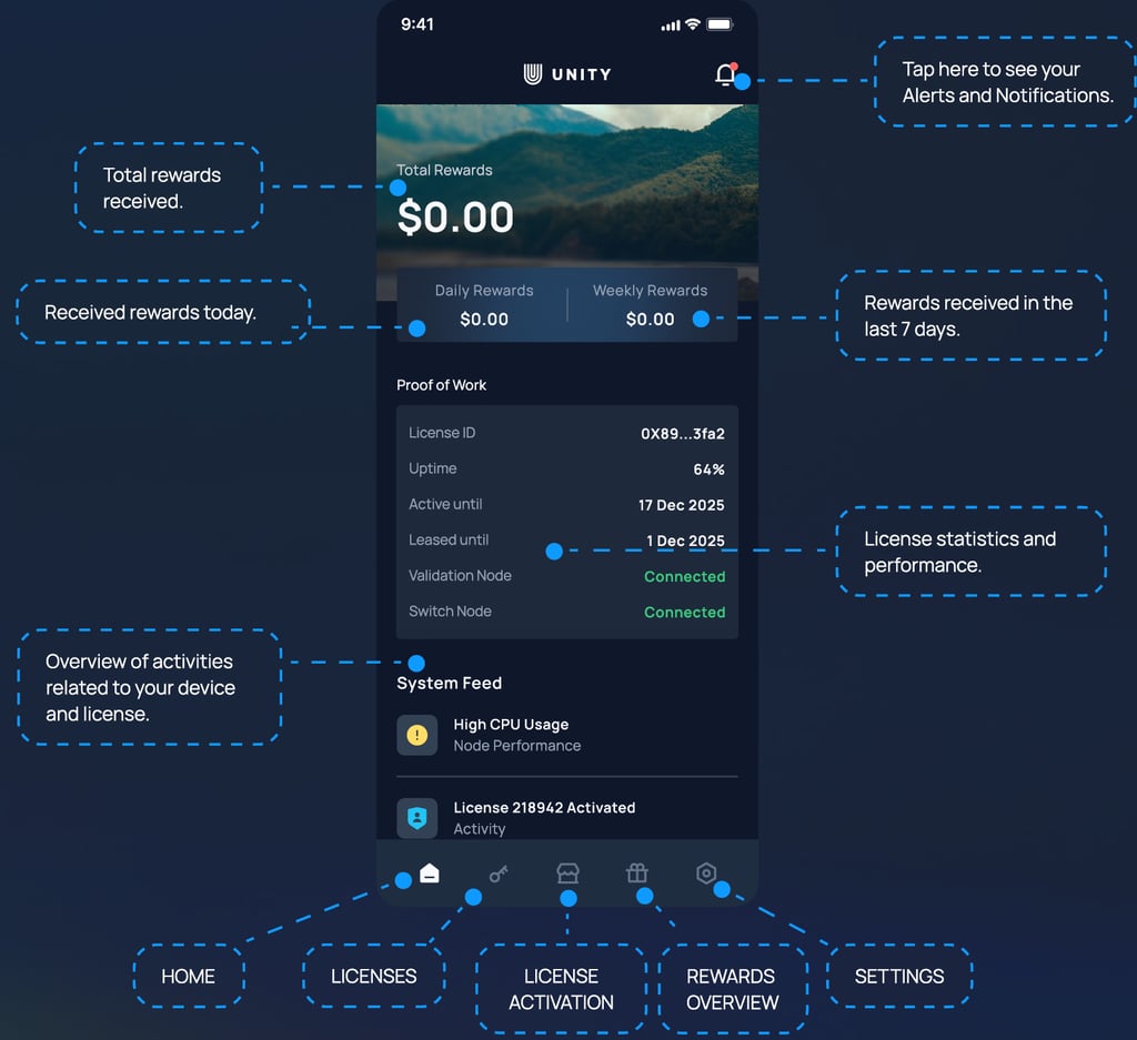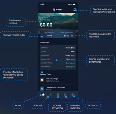 When you connect with the license we send you, a “digital contract” is created. With the pre-agreed reward share and uptime percentage (shown in the calculator above), the rewards are fixed and nobody can interfere with them or with the contract. Of course, you still need to make sure nobody hacks your phone/account, but that risk is the same as with any other app you have on your phone.